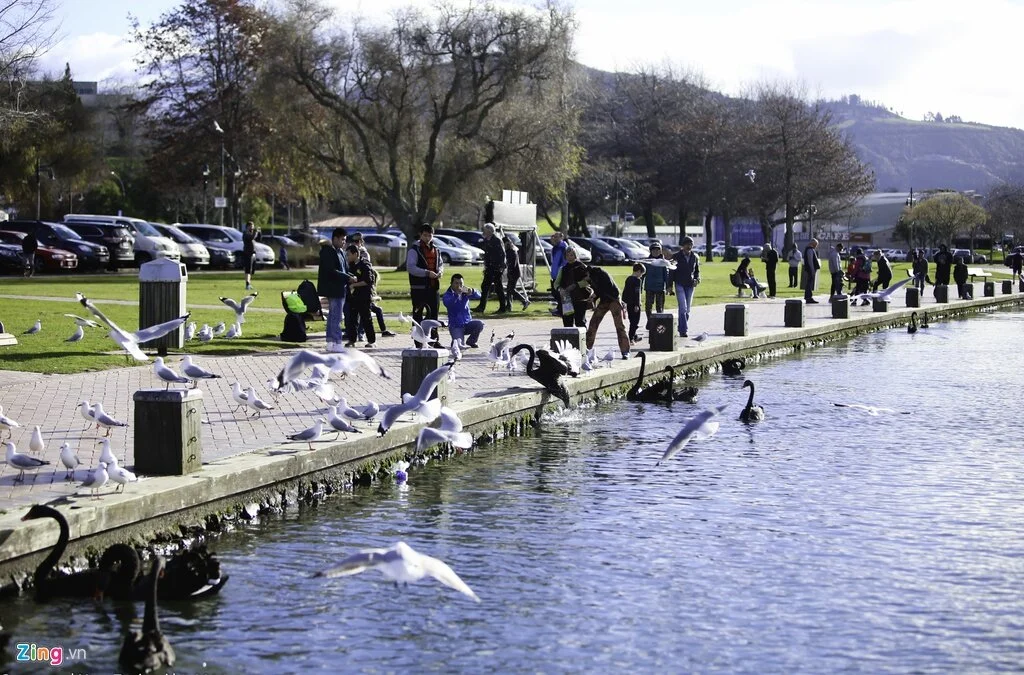 Vào lúc bình minh hoặc hoàng hôn, hàng nghìn chim hải âu bay về đậu kín hồ Rotorua.